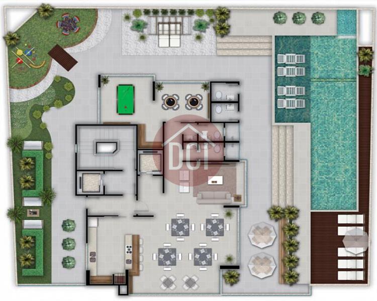 Projeto contemporâneo que adota o conceito de integração da vegetação natural em terraços, jardim e jardim vertical com a área de lazer.